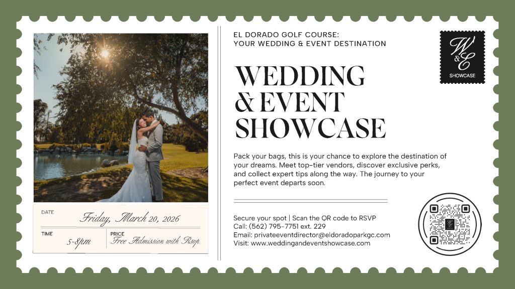 Surrounded by scenic golf course views and romantic photo backdrops, our venue pairs beauty with convenience. Whether you’re planning a wedding, corporate meeting, milestone celebration, or community fundraiser, you’ll enjoy exceptional catering, customizable packages to fit every budget, and personalized service from our expert event team. At El Dorado Park, we make your dream day seamless, stunning, and truly one-of-a-kind.